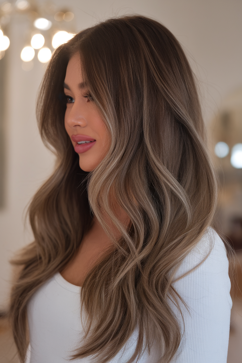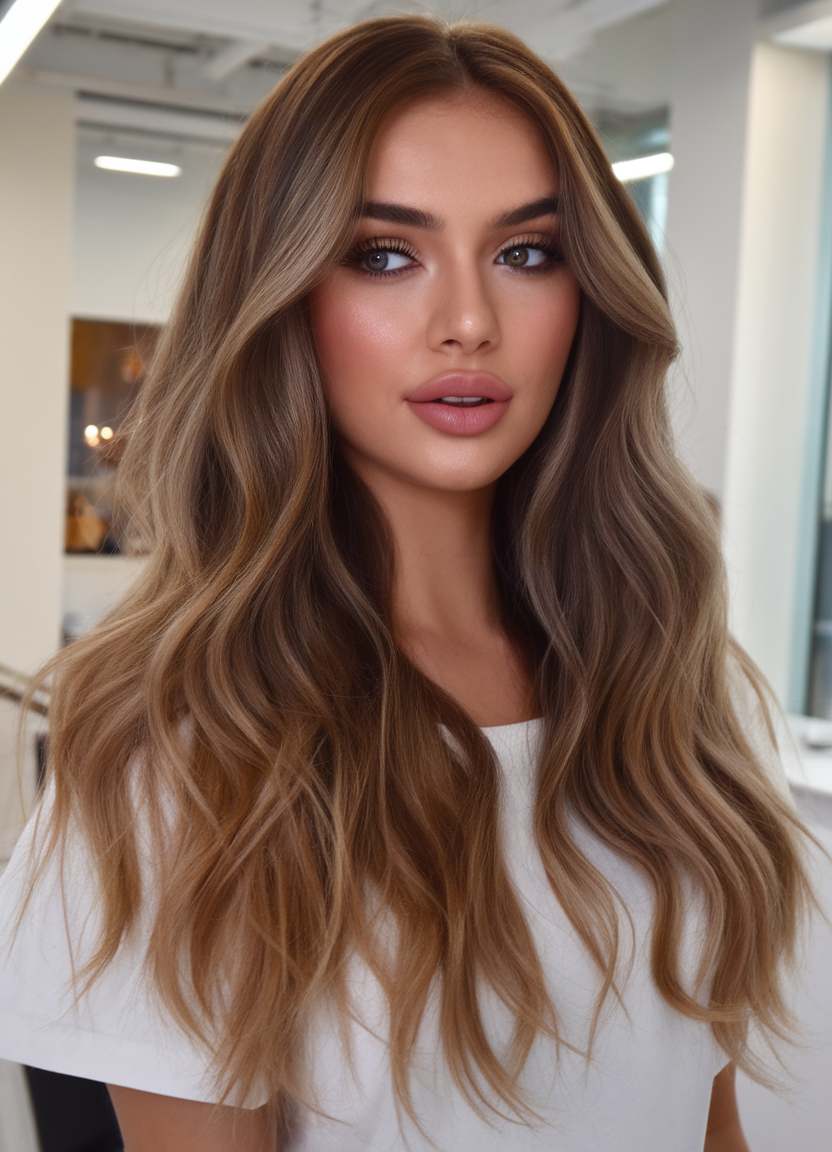 A stylist combines a cool brunette base color with soft Milktea-toned balayage highlights on the face and lengths of the hair. The blonde balayage brunette color placement works to brighten the face while enhancing the overall look. Wavy hair with loose, natural textures adds body to the look for warm summer days. This shade serves as an elegant warm brown hair color idea for summer 2025, offering flexible and natural coloring with a subtle shine.