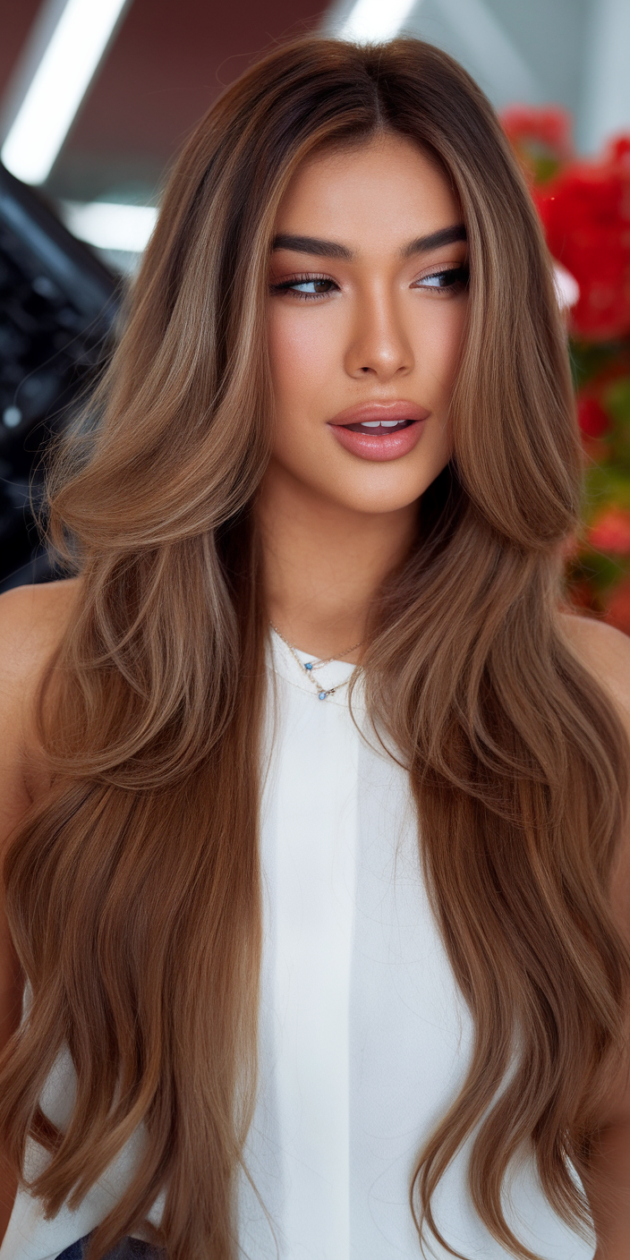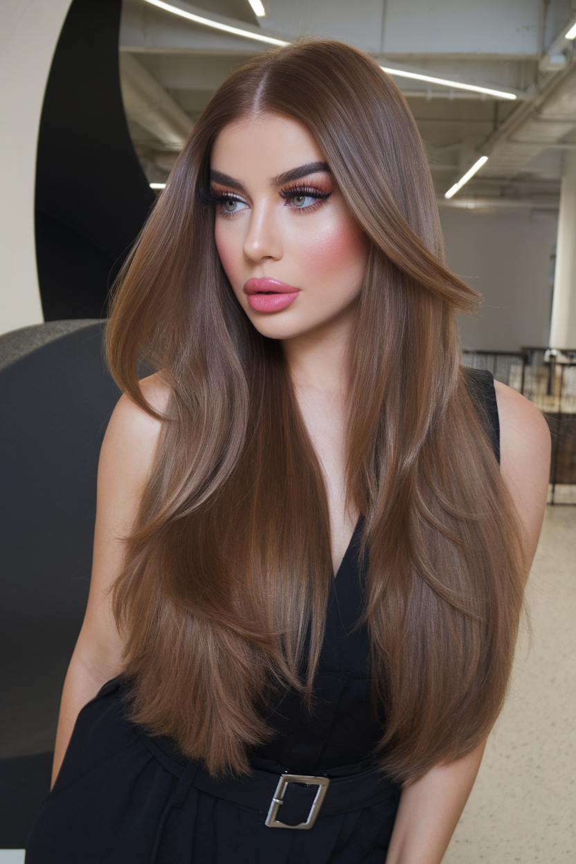 This neat and flowing style features long layers in a sleek mocha brown hue. Uniform color application gives the hair both natural shine and a polished finish. People who want natural-looking colors need minimal maintenance as this style option stays fashionable forever. The shade is perfect for warm depth because of its skin-friendly tones.