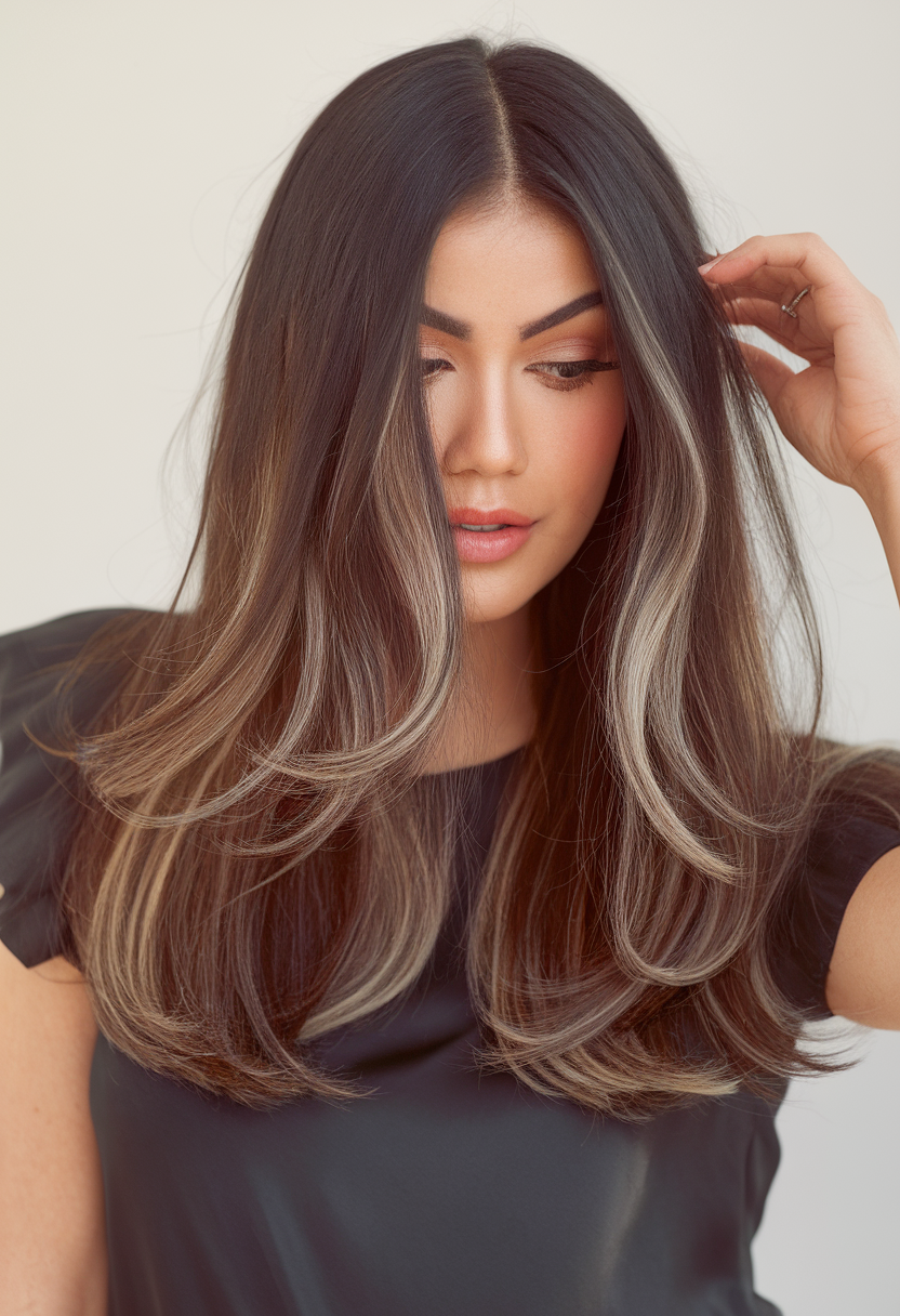 This style features straight lines that combine cool-toned blonde balayage highlights with a dark ash-brown base. The light pieces in this hairstyle enhance the overall color appearance while maintaining the deep tone of the base. People who enjoy sleek yet simplified blonde balayage brunette hairstyles will appreciate this blend. The color combination is perfect for cold complexions while adding sophisticated elegance to any ensemble.