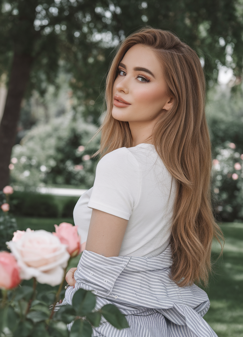 The hair color brings out natural mid-brown tones that combine with soft golden reflections that intensify with sun exposure. A casual, loose style with soft waves keeps the whole look natural and light. Color choices allow those with dark blonde hair to enhance their natural beauty with pale summer tones. A perfect example of low-maintenance, warm-weather beauty.