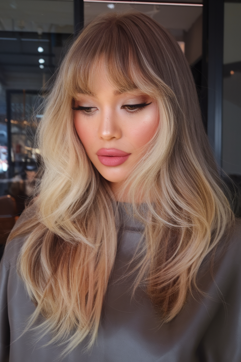 #4 Blonde Balayage with Curtain Bangs and Mushroom Tones