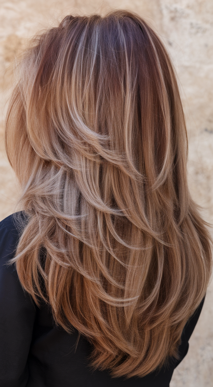 Layered and voluminous, this brown color creates a natural base with soft, feathery blonde highlights. The cut enhances movement and subtly brings out different hues. Spring transitions smoothly into summer when this color brings enough brightness throughout the season. The cut combines pleasant tones with plenty of body structure for a beautifully fresh effect.