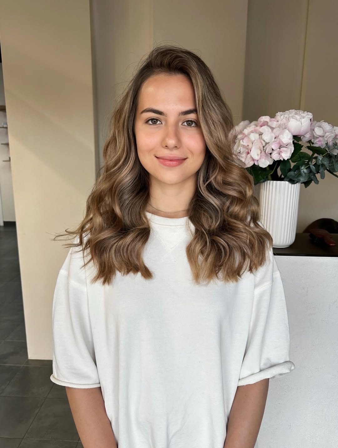 This is where things start to loosen up. The color shifts into a slightly Light, warmer brunette with soft movement running through it. It’s not overly styled – just those easy, undone waves that catch the sun in the prettiest way. You can see hints of Honey and maybe even a touch of Highlights caramel woven subtly through the mid-lengths.