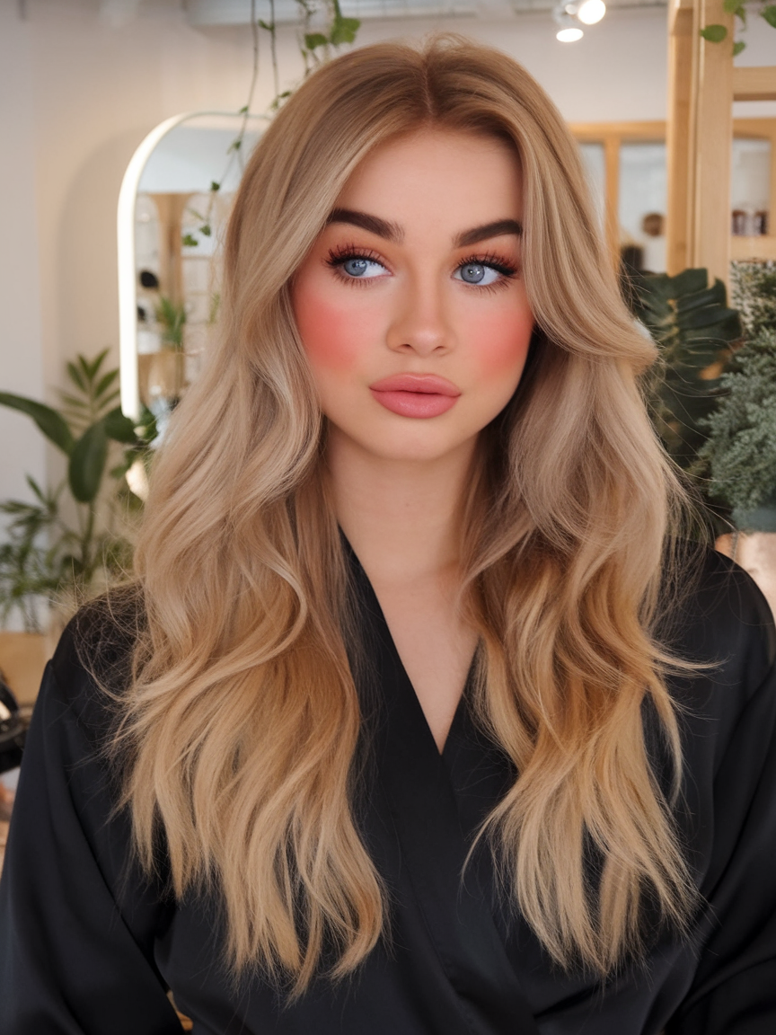 This long flowing style embodies soft voluminous waves blended with realistic new growth and sun kissed tones. These wind swept lighter sections that frame the face elevate the style without contrast. This is a stunning example of effortless summer energy. It’s ideal for those seeking understated glamour in 2025.