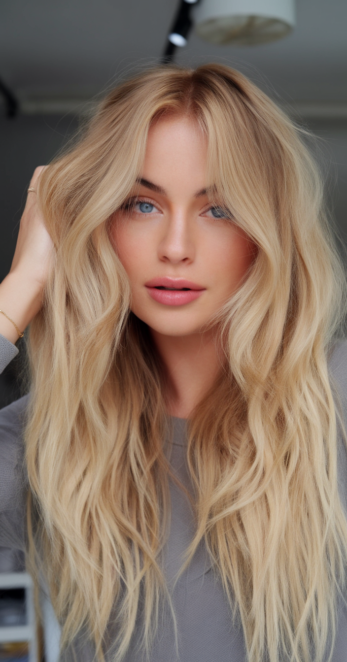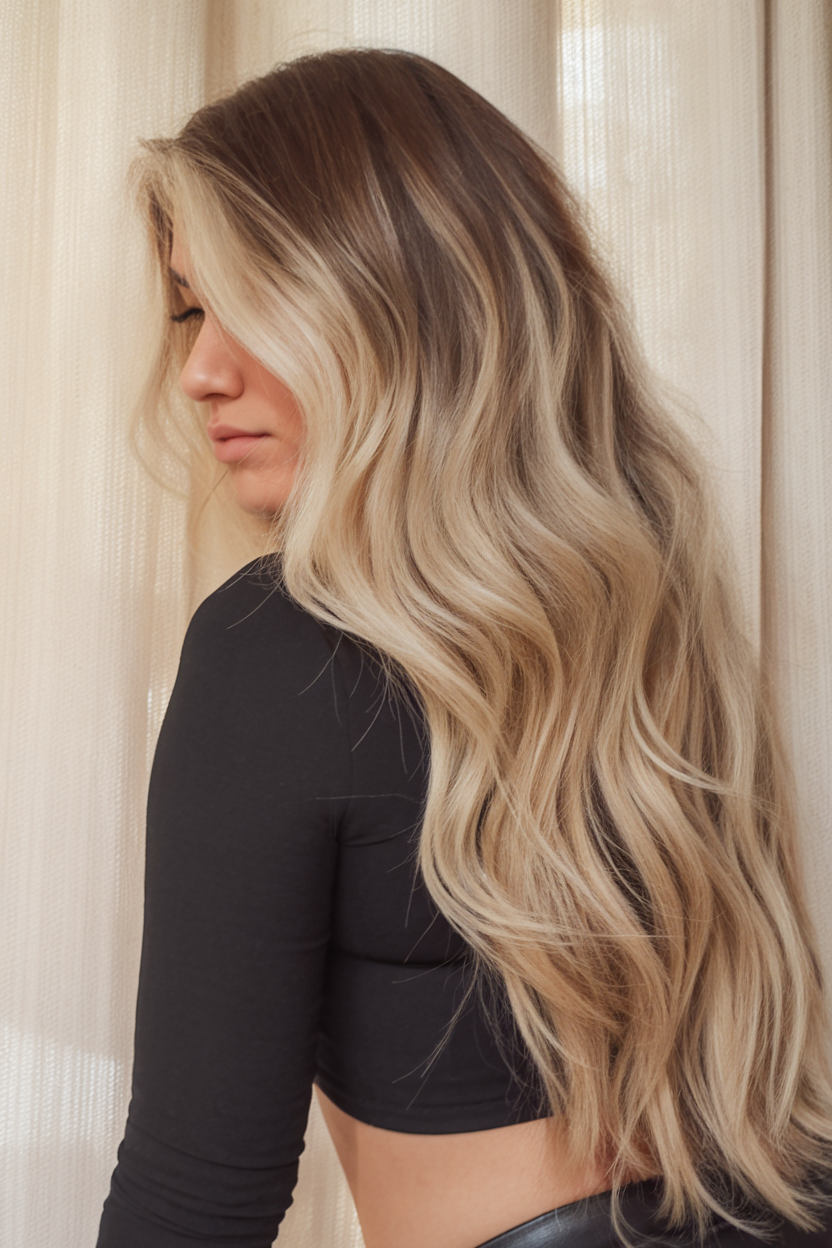 This look incorporates layering on long hair with soft, ash toned platinum blondes. The balayage honey tips are well blended and catch the light beautifully, dancing in the sun. These soft curls add so much body to the lengths without much effort. It blends effortlessly well with the Soft Summer Hair Color for Blondes 2025: Effortlessly Bright Looks idea.