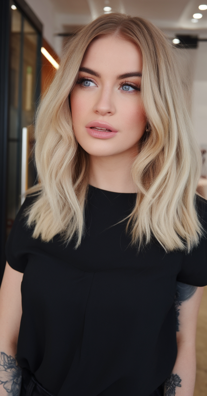 This hairstyle features sun-kissed beach-looking waves, subtle layering, and a middle part. The hair’s natural movement adds volume to the hair and gives it a light summery feel. It’s a great choice in terms of effortless styling for all blonde lovers in 2025. It goes well with warm-neutral tones which are favorable to most skin colors so it is an easy choice for many.