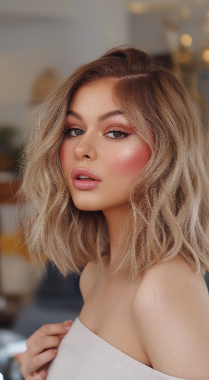 The short shoulder hairstyle with soft waves and blended dark roots is depicted in this style. The blonde highlights are not too contrasting, giving the styling an updated version of the balayage for shorter hair. This hairstyle captures the essence of modern cuteness while still being practical. Offers the best brightness with the least maintenance during the year 2025.