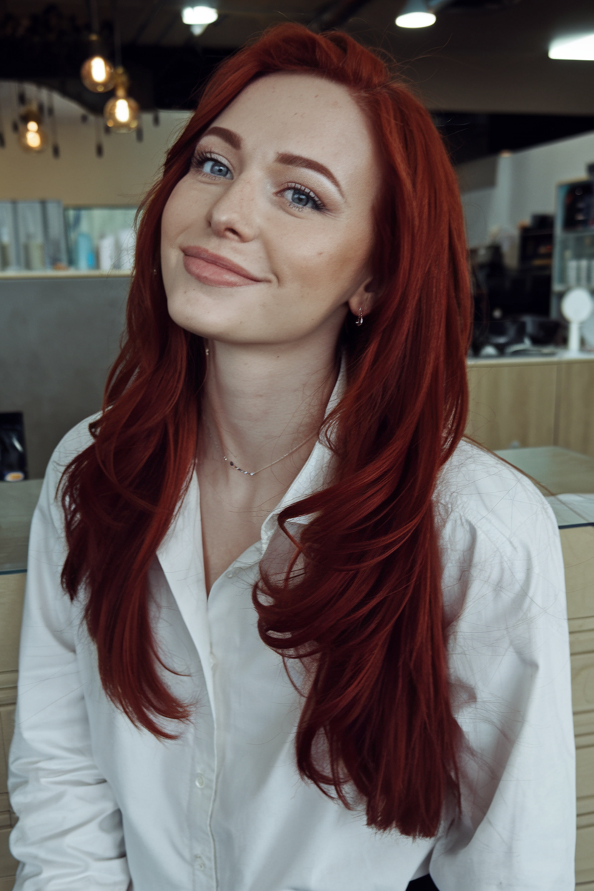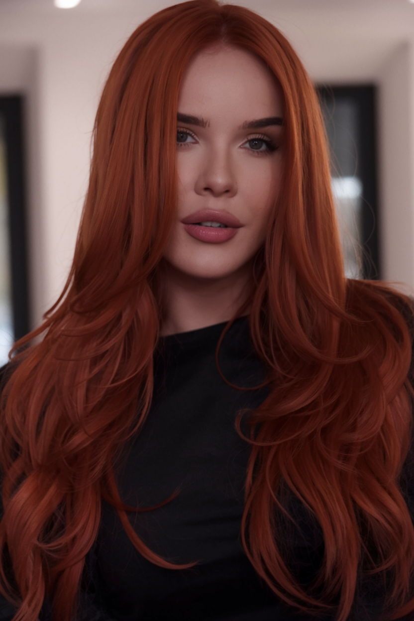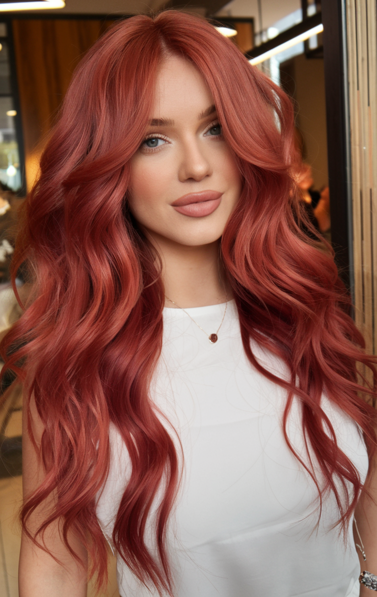 This stunning look showcases long, flowing hair in a beautiful bright copper shade, ideal for fall red hair 2024 trends. The soft, voluminous waves add movement and depth, giving the color a toned and radiant finish. The shade is perfect for those seeking rich auburn undertones without losing the vibrancy of the copper. This color offers a glowing warmth, making it one of the top ideas for those who love rich shades with minimal maintenance, as it suits various skin tones and facial features.