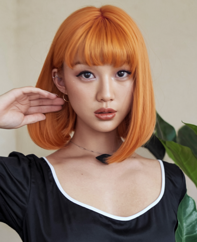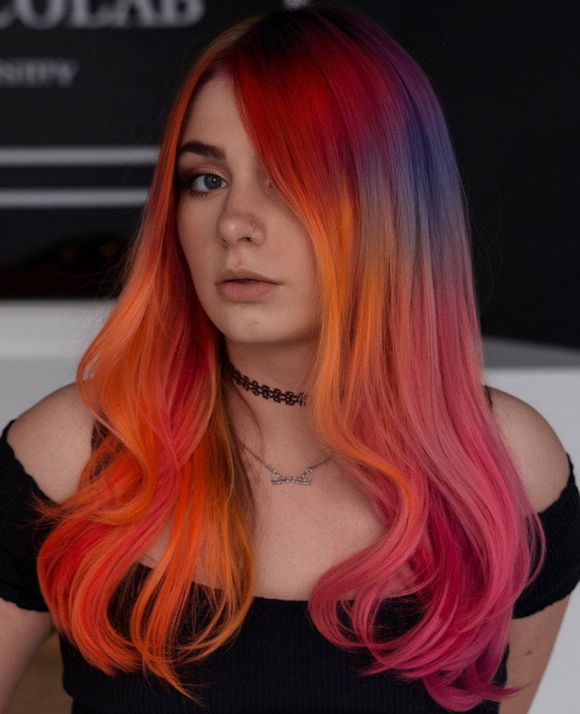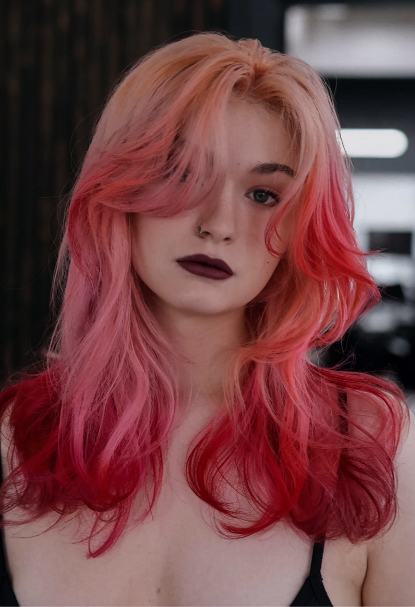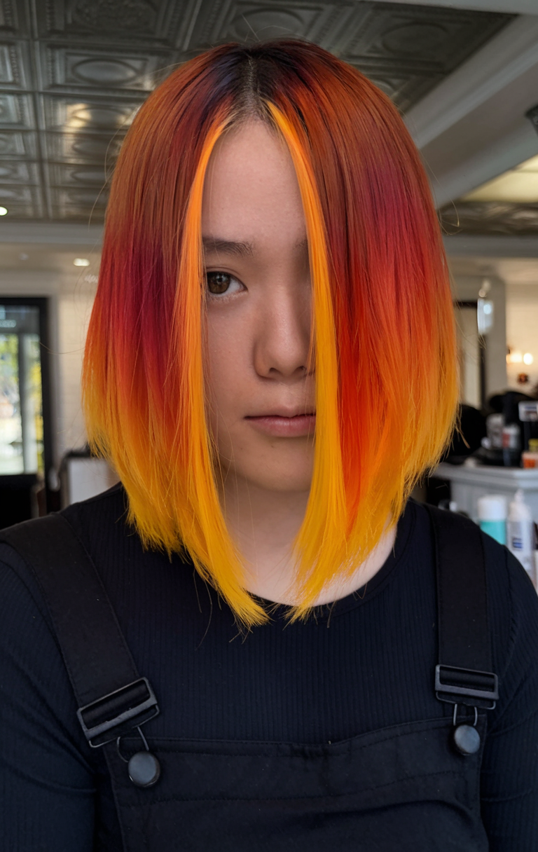 This bold style is all about vivid colors, blending shades of bright auburn into fiery orange and yellow tones. The smooth transition of the colors creates an intense fall hair dye look for 2024, with shorter hair lengths adding more edge to the cut. The dark roots balance the explosion of colors, while the vibrant orange ends ensure that the look stands out. For those looking for a striking ombre idea, this vivid color palette is sure to make a statement this season.