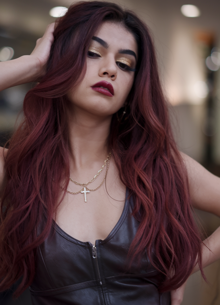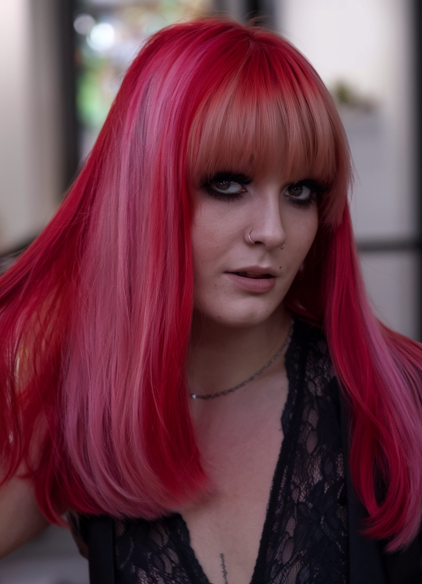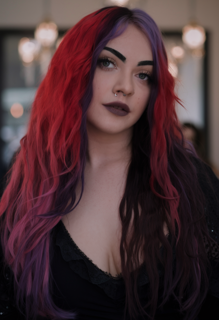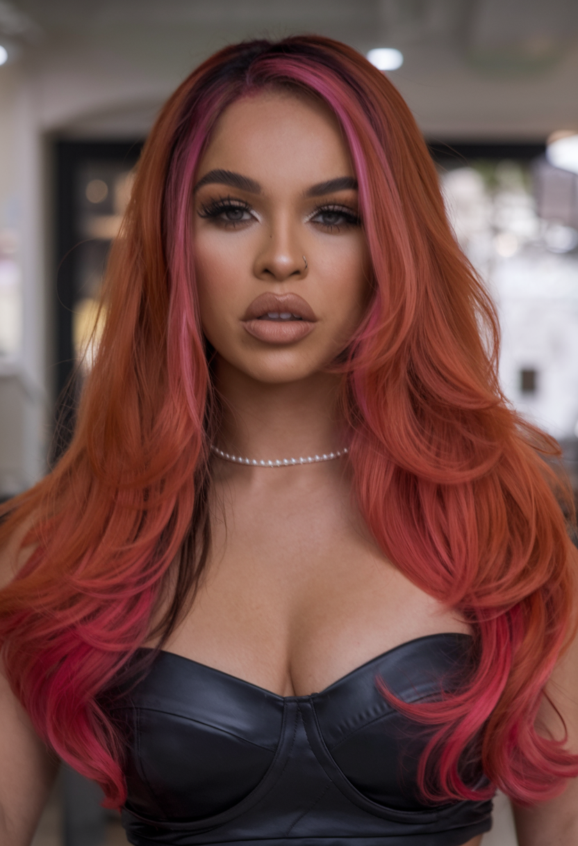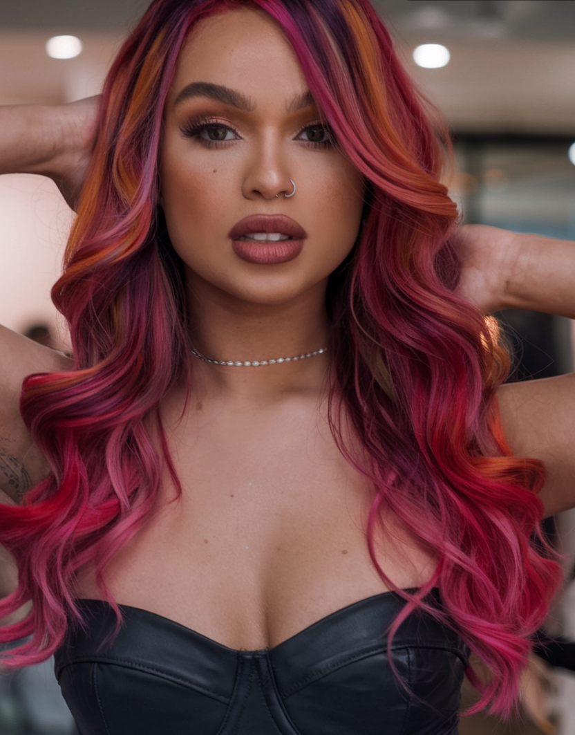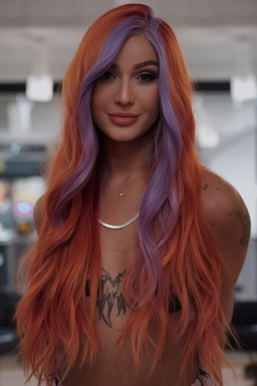 This playful and unique color combination of purple and bright copper is perfect for someone looking to experiment with vivid colors. The flowing waves showcase the bold transition between the two shades, making it an exciting and eye-catching option for fall red hair 2024. The vivid purple highlights complement the dark wine base, creating a vibrant contrast. This look is perfect for those who love bold ideas and want their hair to be a reflection of their adventurous style.