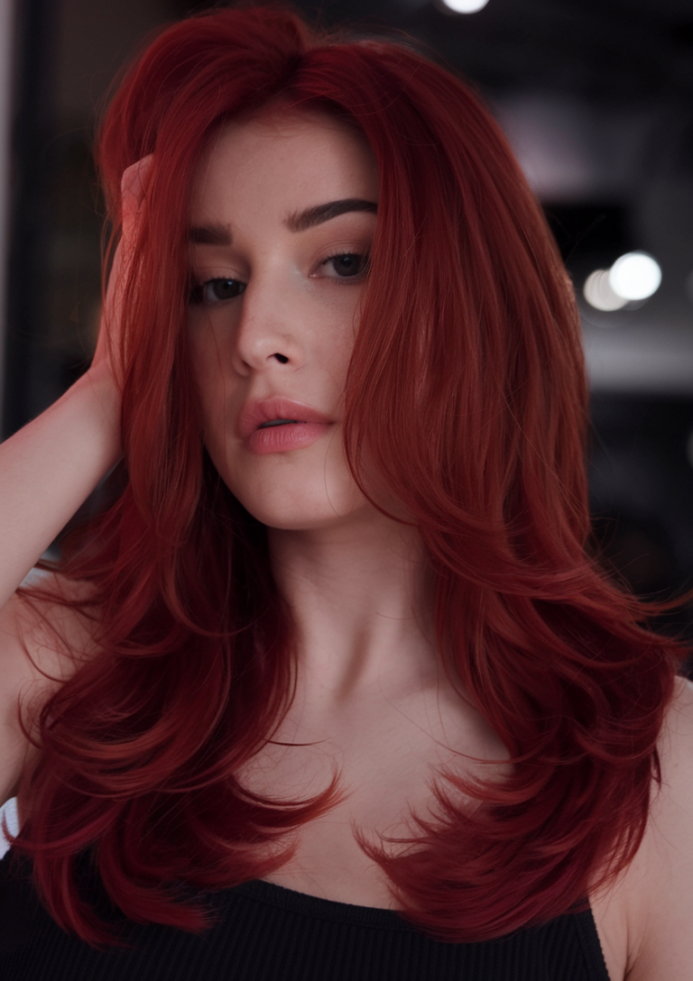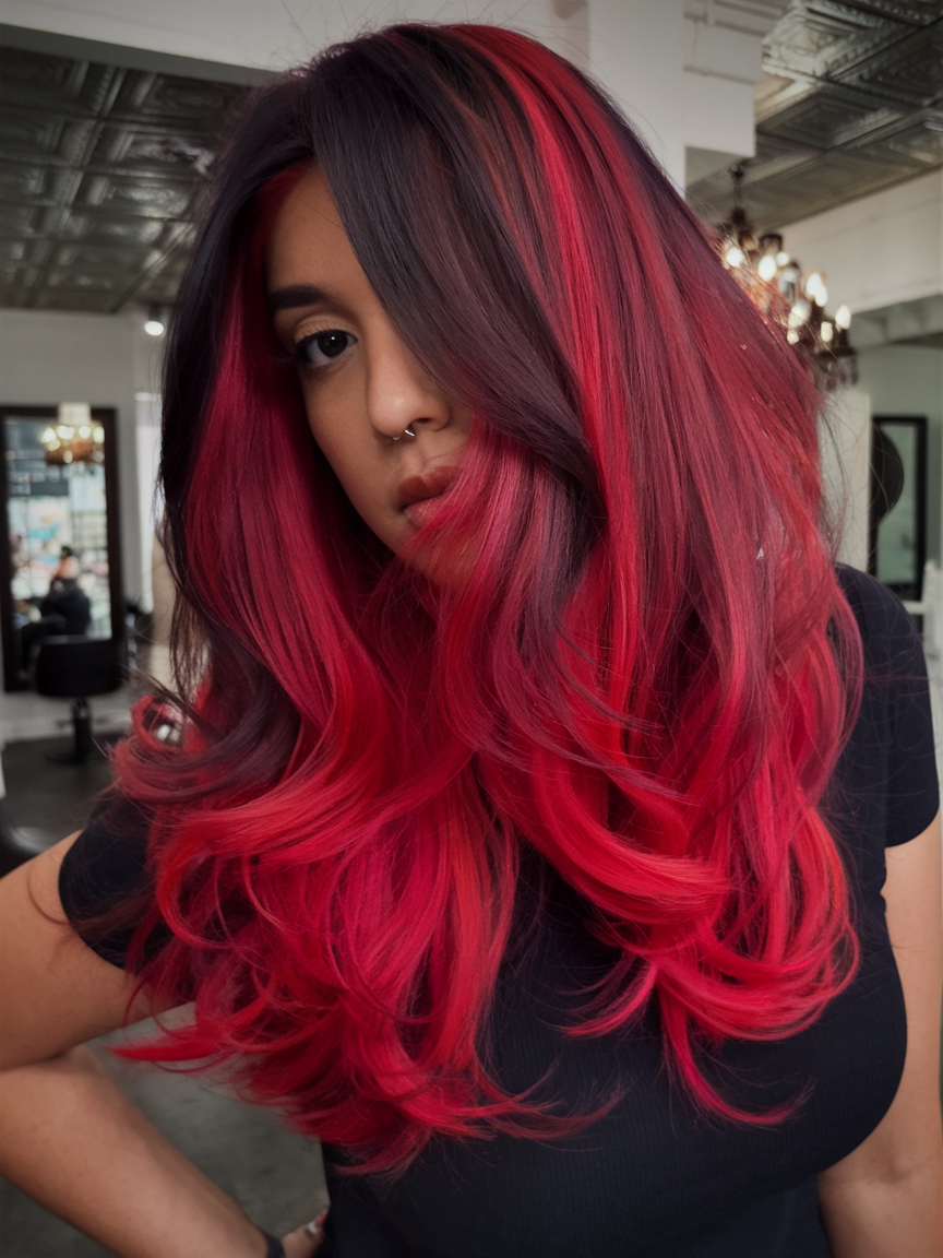 A mix of dark wine and vibrant cherry brings bold dimension to this balayage. The dark roots transition seamlessly into deep wine shades, accentuated by the vivid ruby tones that cascade throughout the mid-lengths. This look is full of depth and intensity, perfect for anyone wanting a daring yet polished color idea for fall red hair 2024. The layered waves enhance the richness of the color, offering a dynamic and edgy take on classic dark tones, making it a beautiful choice for those who love rich highlights with a modern twist.