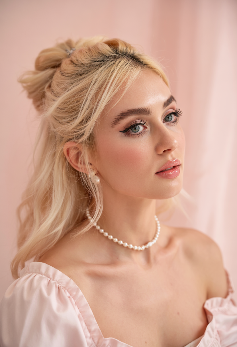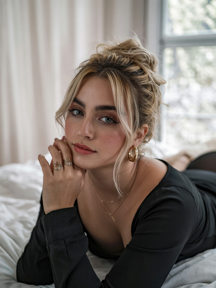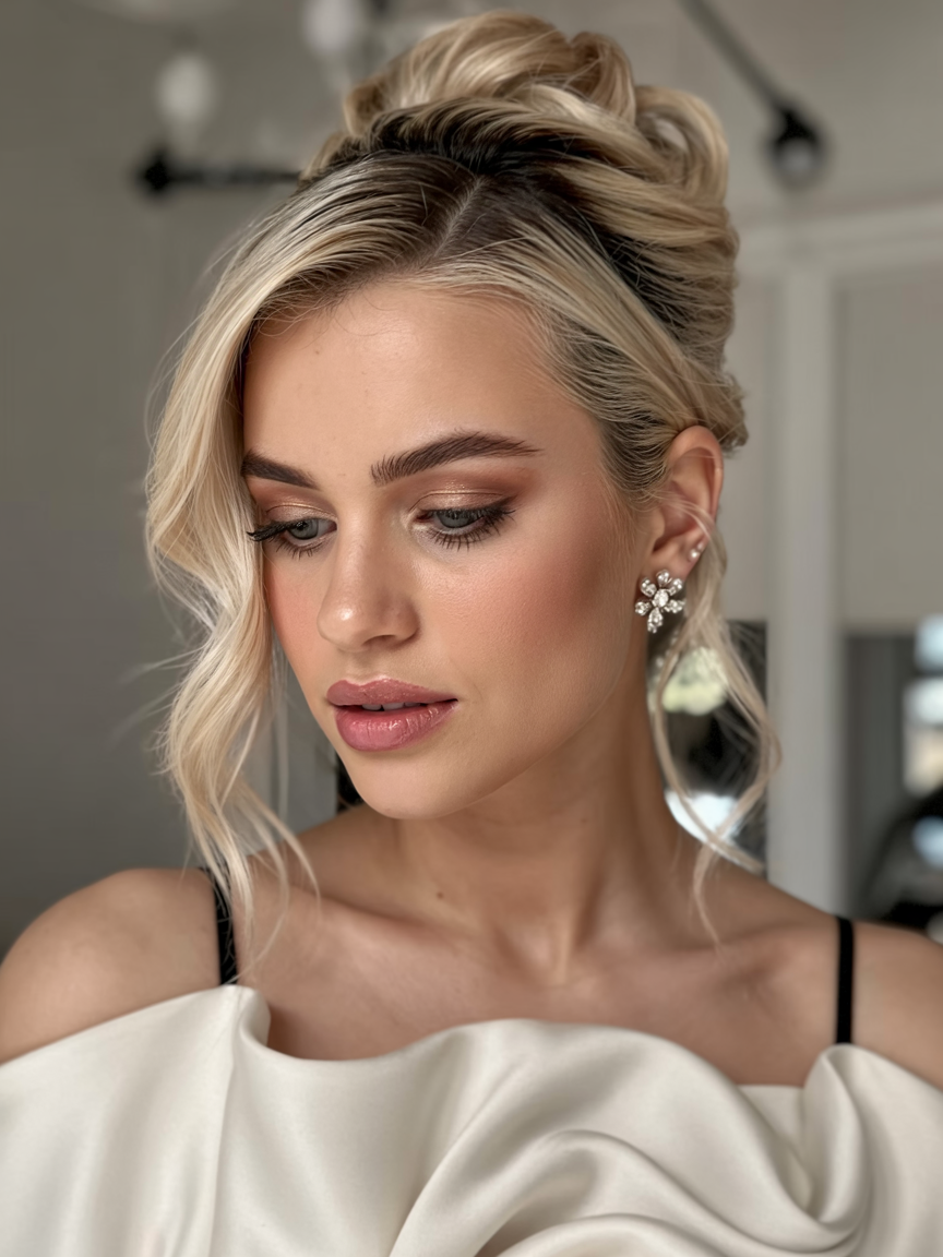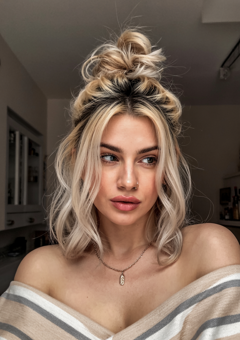 Softly parted bangs join the tousled bun to create graceful volume for a style ideal for all occasions. The color combination of light blonde with dark roots brings out the texture while complementing medium to long hair lengths. A relaxed birthday hairstyle or an everyday updo works naturally well with this hairstyle. This hairstyle presents itself as a top choice from the May 2025 hairstyle trends selection, while maintaining a feminine essence and balanced appearance.