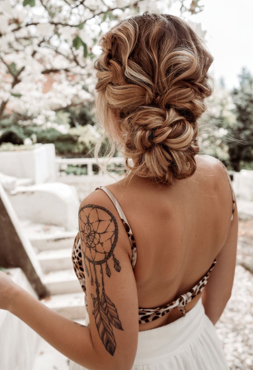 Dark, tousled curls are given delicate floral embellishments that weave their way through the strands. A length of natural and medium length hair shows depth through its soft brown to copper color mix. This hairstyle is an excellent choice for birthdays while being absolutely suitable for any spring social event. The combination of nonchalance and femininity in this aesthetic style makes it ideal for creative women.