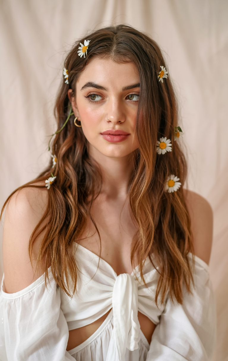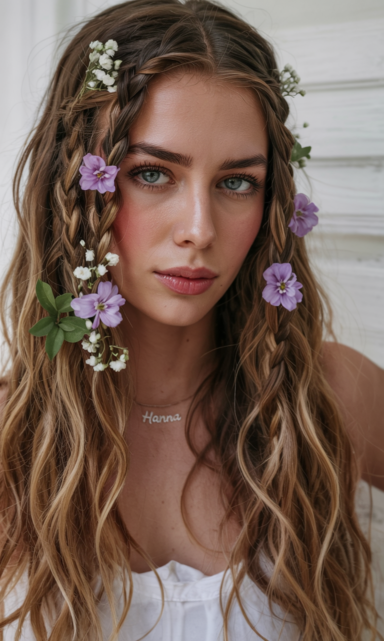 Curled braids along the facial structures are given floral accents that combine with natural waves running through long, loose hair. Every twist is enhanced as honey highlights add lightness to the medium brunette foundation. This romantic and artistic look is perfect for spring birthdays and creative lifestyle photo shoots. This style suits women who want both natural elements and whimsical qualities in their look.
