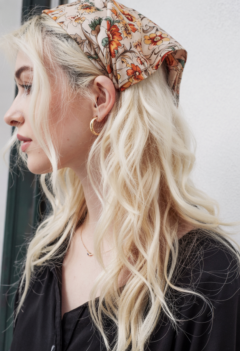 This soft, wavy style is held in place with a printed silk scarf. Platinum blonde foundations with natural lowlights create a full and subtle dimension throughout the style. This hairstyle works for daily spring outings and helps to elevate everyday styles with its elegant charm. Long hair can experience a light, elegant transformation that looks natural with this choice.