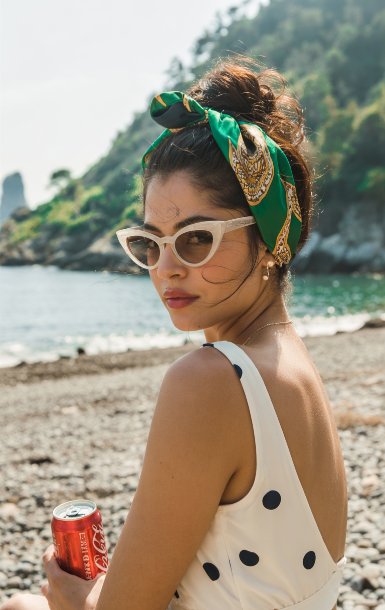 Textured, loose wavy hair moves freely with a soft and voluminous natural light blonde look. The finishing touch is a sun-protective floral scarf that attractively adorns the head while providing overall style enhancement. This style provides relaxation during school activities and serves as both vacation and protection during light, stylish times. Women who love a simple yet stylish look will appreciate this effortless look.