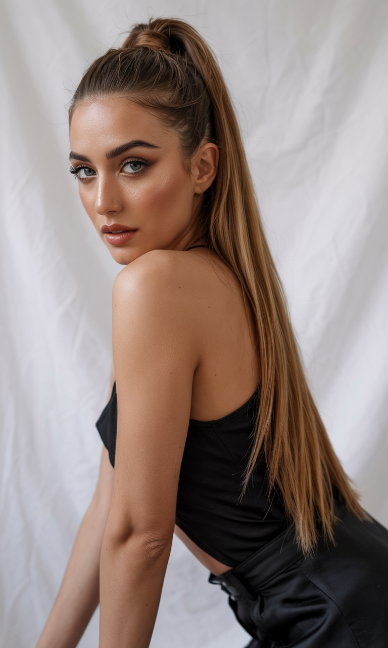 A sleek high ponytail features straight, long hair that is tightly pulled back into an elevated and neat style. The style retains its natural luminosity throughout the parting and is suitable for both professional and formal occasions. The look is suitable for those with long hair, while its refined finish allows for daily and school activities. One of the May 2025 hairstyle ideas that combines modern edge with simple elegance.