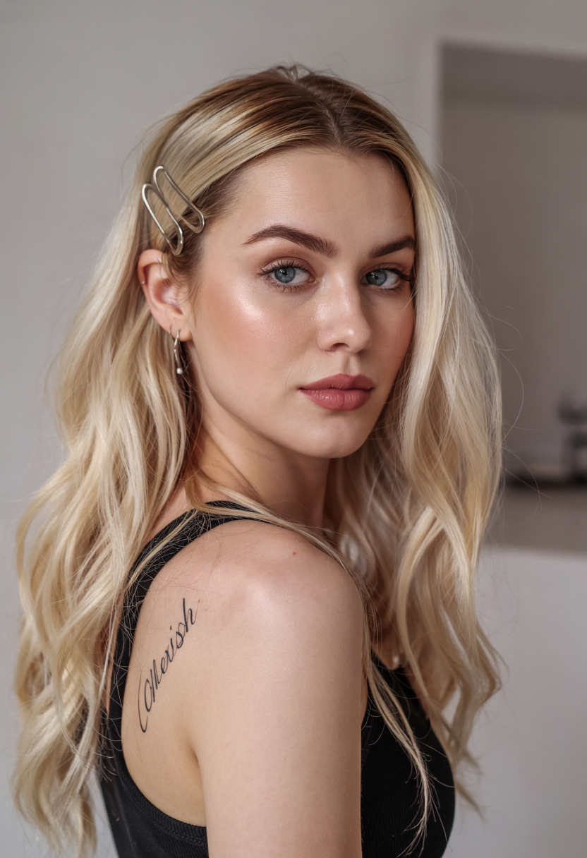 This style features soft waves with natural blonde tones and a delicate side part. The metal clips in this style provide a slight restraint without altering the natural look, which works well for both school days and easy weekend looks. Individuals with any length of hair from shoulder to long can easily achieve volume and natural movement with this style. Women with a preference for low-effort, polished styles will find the natural finish to be a perfect match.