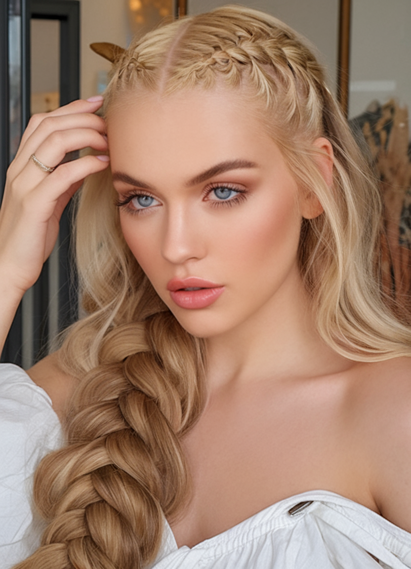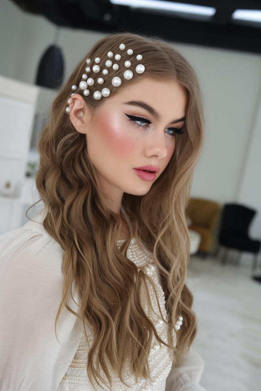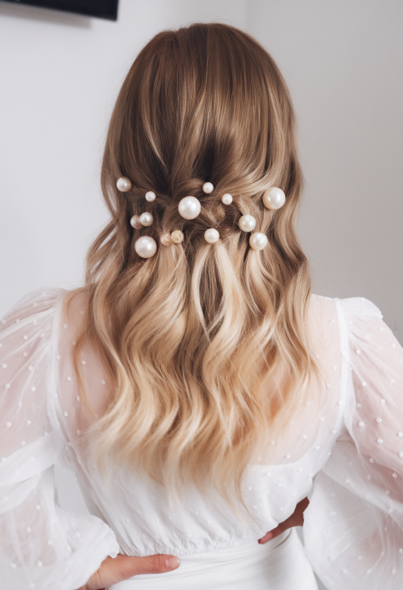 A half-up braided look with a modern twist, this hairstyle is adorned with scattered pearl embellishments for a soft, feminine finish. The beachy waves add movement and volume, making the style appear full and textured. The color is a perfect mix of honey blonde and warm caramel, reflecting light beautifully. This look is ideal for special occasions or an elevated everyday style.