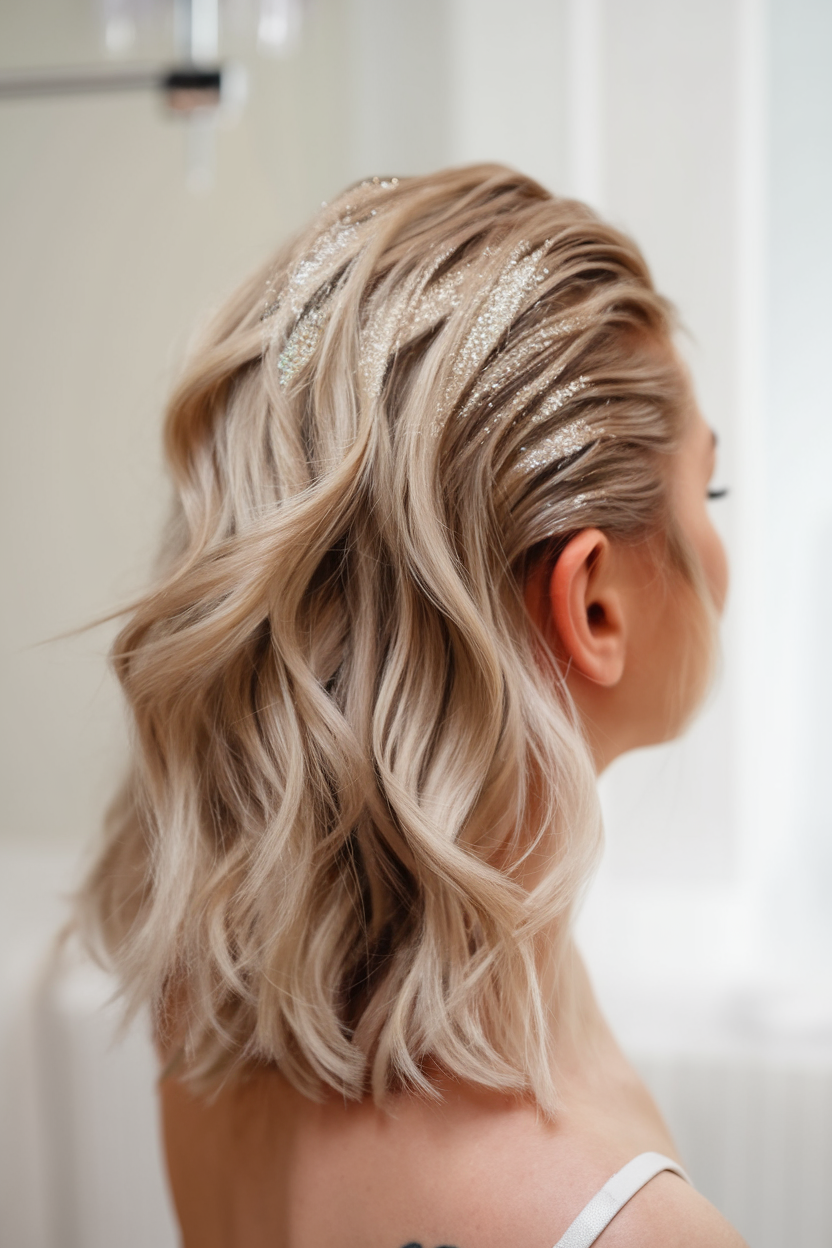 This shoulder-length bob showcases soft waves that add dimension and structure to the cut. The champagne blonde color is brightened with subtle icy highlights, making the style fresh and vibrant. A slicked-back crown with glitter accents gives this look a bold and glamorous finish. This is an excellent choice for anyone wanting a chic yet playful spring quick weave.