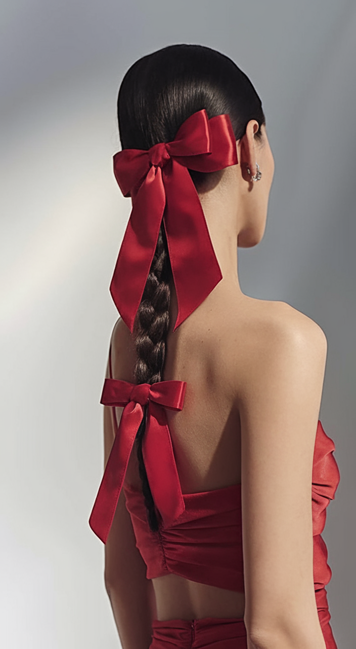 This long, sleek braid is a bold and polished look with a smooth, high-shine finish. The deep espresso brown shade enhances the structured style, while large satin red bows add a striking contrast. The tight, uniform plait creates a refined silhouette, making it perfect for an elegant yet modern spring quick weave.
