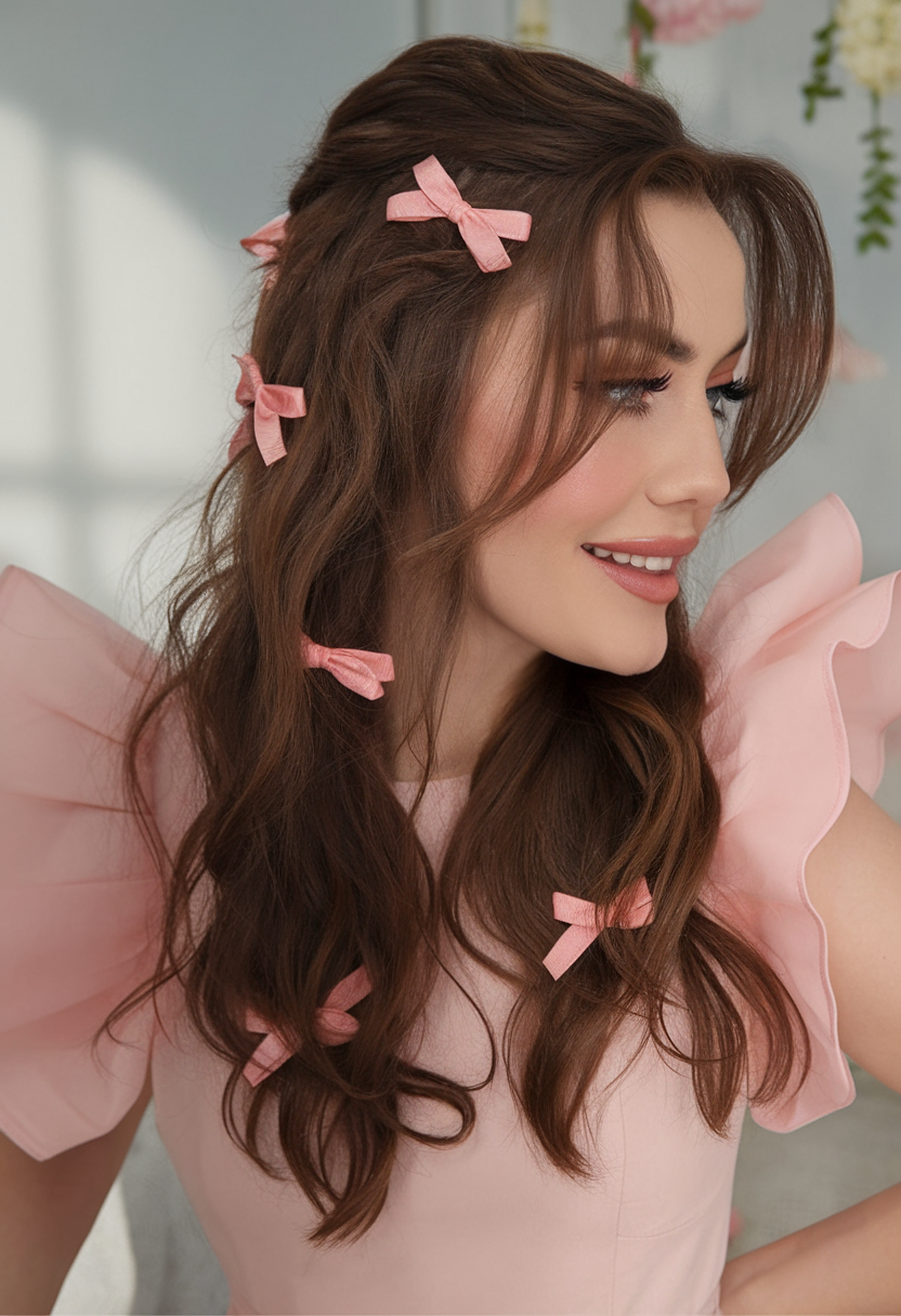 This half-up half-down style features cascading loose waves, creating a soft and romantic effect. The rich chestnut brown hue is complemented by multiple pink ribbon bows, adding a youthful and feminine touch. The lightly tousled texture keeps the look relaxed and effortless. Ideal for those seeking a charming yet stylish spring quick weave hairstyle.