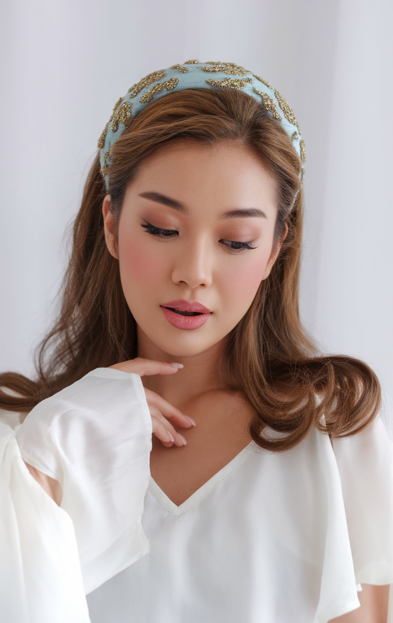 This shoulder-length wavy hairstyle is enhanced with a padded headband embroidered with gold details. The warm caramel brown shade is rich and glossy, while the soft waves provide movement and volume. The smooth blowout finish gives the style an elegant, put-together look. A perfect spring quick weave choice for those who love a sophisticated yet trendy accessory.