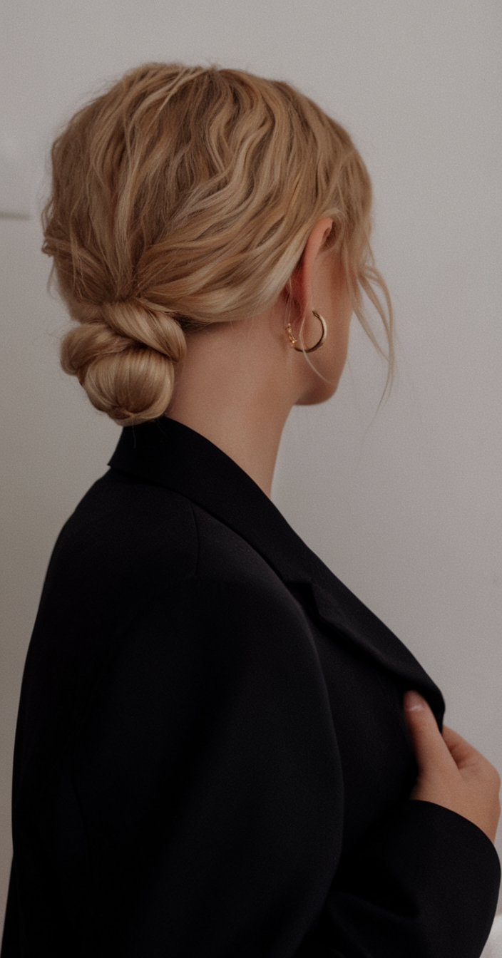 This low bun is styled with loose waves for an undone, relaxed look. The warm honey blonde color is accentuated by subtle lowlights, adding dimension and depth. Wispy face-framing strands create a soft, elegant effect, making it a perfect spring quick weave for those who love effortless beauty.