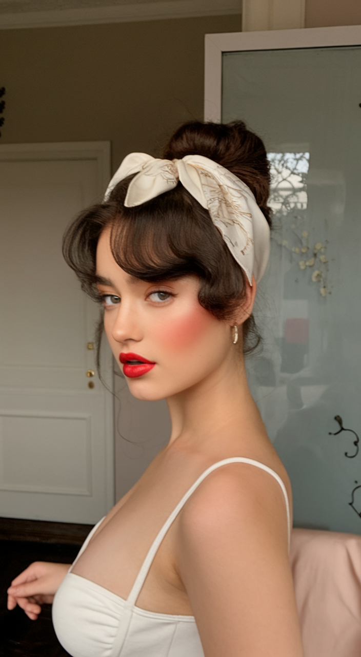 This messy high bun is paired with a silk headscarf, giving it a vintage and sophisticated touch. The rich chocolate brown color enhances the volume, while curtain bangs frame the face beautifully. The scarf adds a stylish accent, making this spring quick weave ideal for those who love a retro-chic aesthetic.