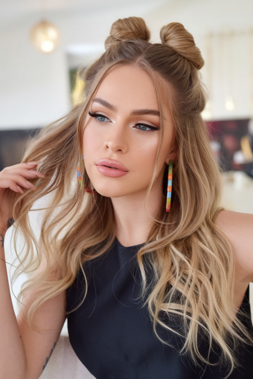 This half-up hairstyle features two small twisted buns, giving it a youthful and playful touch. The honey blonde color blends seamlessly with light balayage highlights, creating dimension and depth. Loose beach waves frame the face, making this spring quick weave a perfect mix of fun and stylish.