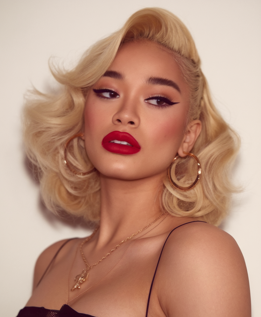 This retro-inspired voluminous bob features soft, sculpted Hollywood waves for a glamorous effect. The warm golden blonde shade adds richness, while the dramatic side-swept wave gives the style a bold, sophisticated touch. This spring quick weave is perfect for those who love a timeless, elegant look with a modern twist.