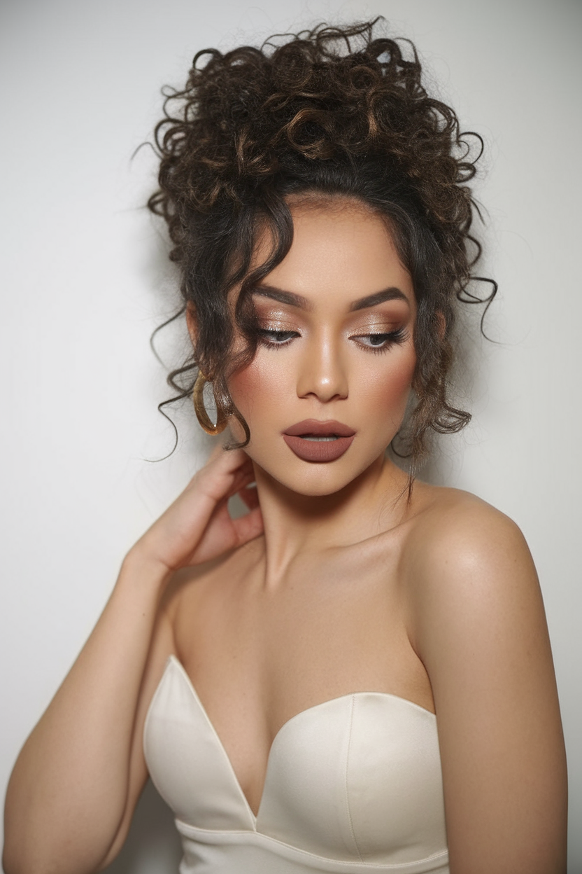 This voluminous high bun features tight, defined curls, creating a romantic and effortless updo. The deep brunette shade adds richness, while loose face-framing tendrils soften the look. This spring quick weave is perfect for showcasing natural curls in an elegant yet relaxed style.