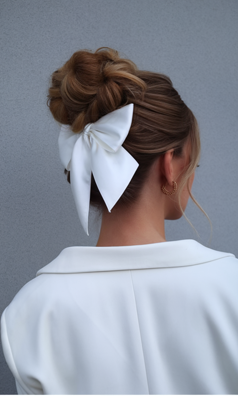 This updo is all about refined elegance, styled with a voluminous bun and neatly pinned strands. The middle part softly transitions into the sleek, twisted bun, offering a pronto styling solution for any occasion. The crisp closure at the back ensures a flawless finish, while the oversized bow adds a touch of classic femininity. This is a must-try look for anyone who loves a spring quick weaves hairstyle 2025 that’s polished and timeless.