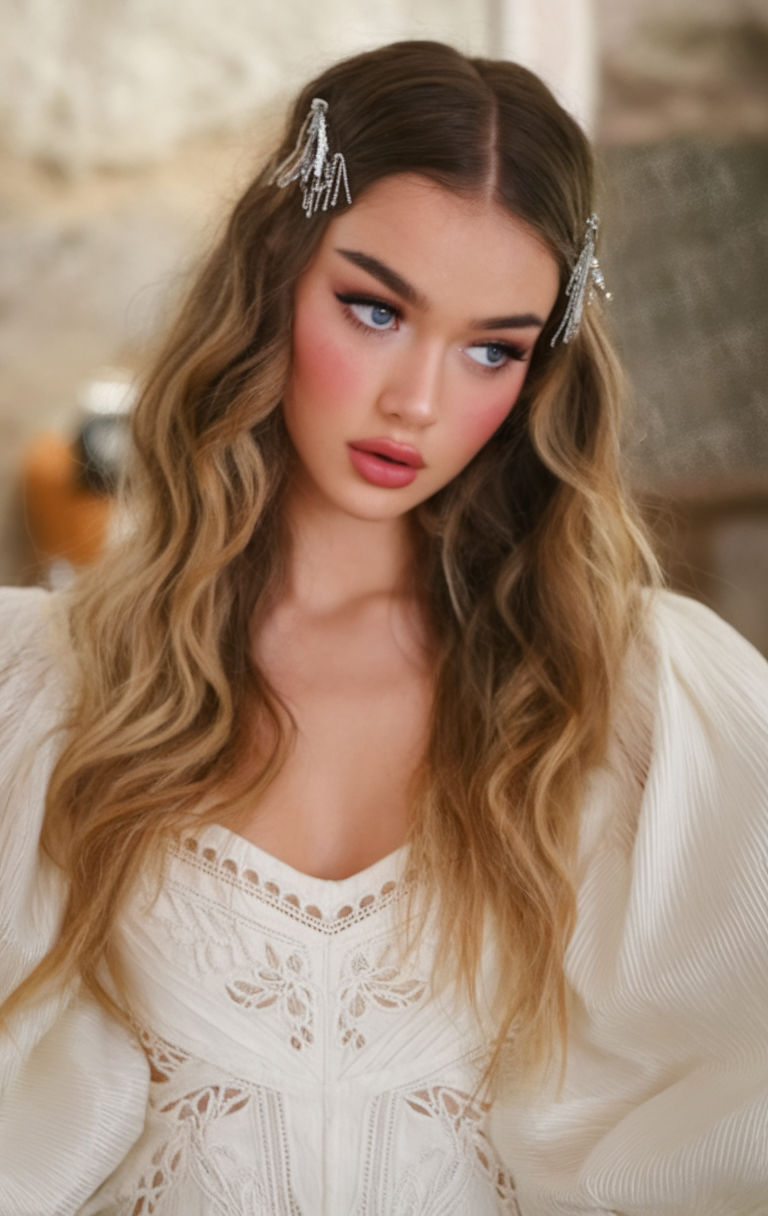 This loose wavy style features a middle part, creating a balanced and voluminous effect. The soft curls frame the face effortlessly, while the rhinestone hair clips on each side add a stylish, vintage-inspired element. The color is a beautiful blend of ash blonde and subtle brown lowlights, giving depth and richness to the waves. This is a chic and timeless choice for anyone looking for a polished yet relaxed look.