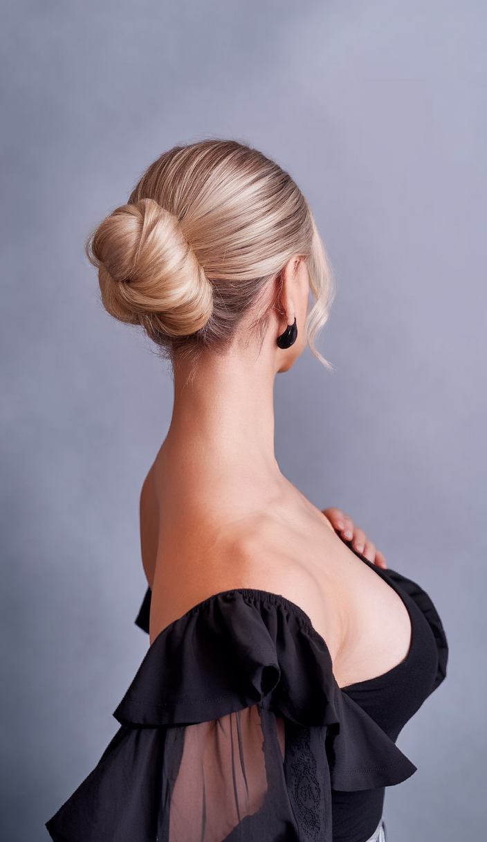 This low bun is a timeless and elegant choice, featuring a smooth, polished finish. The platinum blonde color is enhanced by subtle lowlights, creating dimension and depth. A few softly curled face-framing strands add a delicate touch to this structured style. Perfect for those who love a sleek yet sophisticated spring quick weave updo.