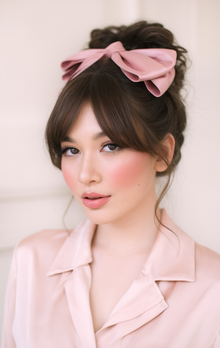 A romantic messy bun styled with wispy bangs and soft, loose tendrils for a natural finish. The deep chocolate brown shade gives the style richness, while the voluminous bun adds texture and movement. A large satin pink bow completes the look, bringing a playful yet sophisticated feel. This style is ideal for those who want a feminine and effortless spring quick weave updo.