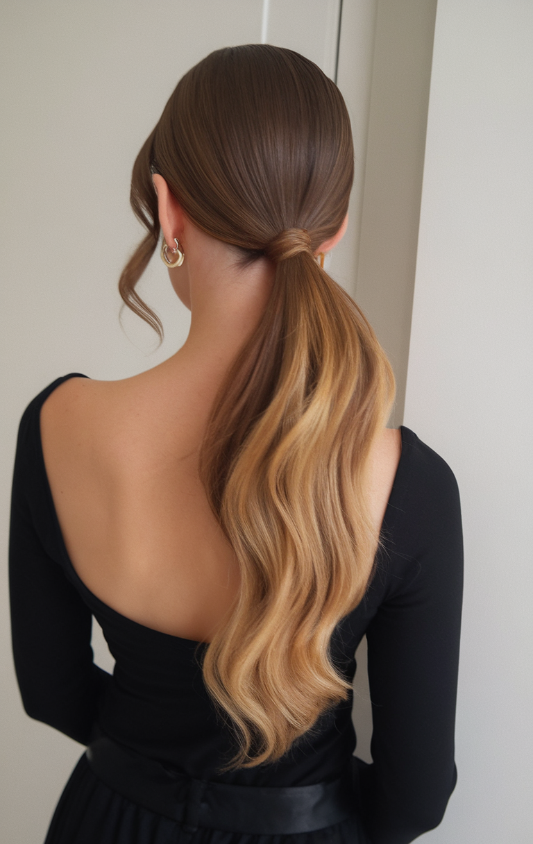 This slick back low ponytail combines elegance with a natural hair touch. The deep brunettes base color smoothly transitions into a soft caramel ombré, making it a fun yet simple style for long hair lovers. The addition of loose waves at the ends gives the hair a cute, effortless movement, perfect for both a quick everyday look or an evening event. This is an ideal option for those who love a polished but easy style.