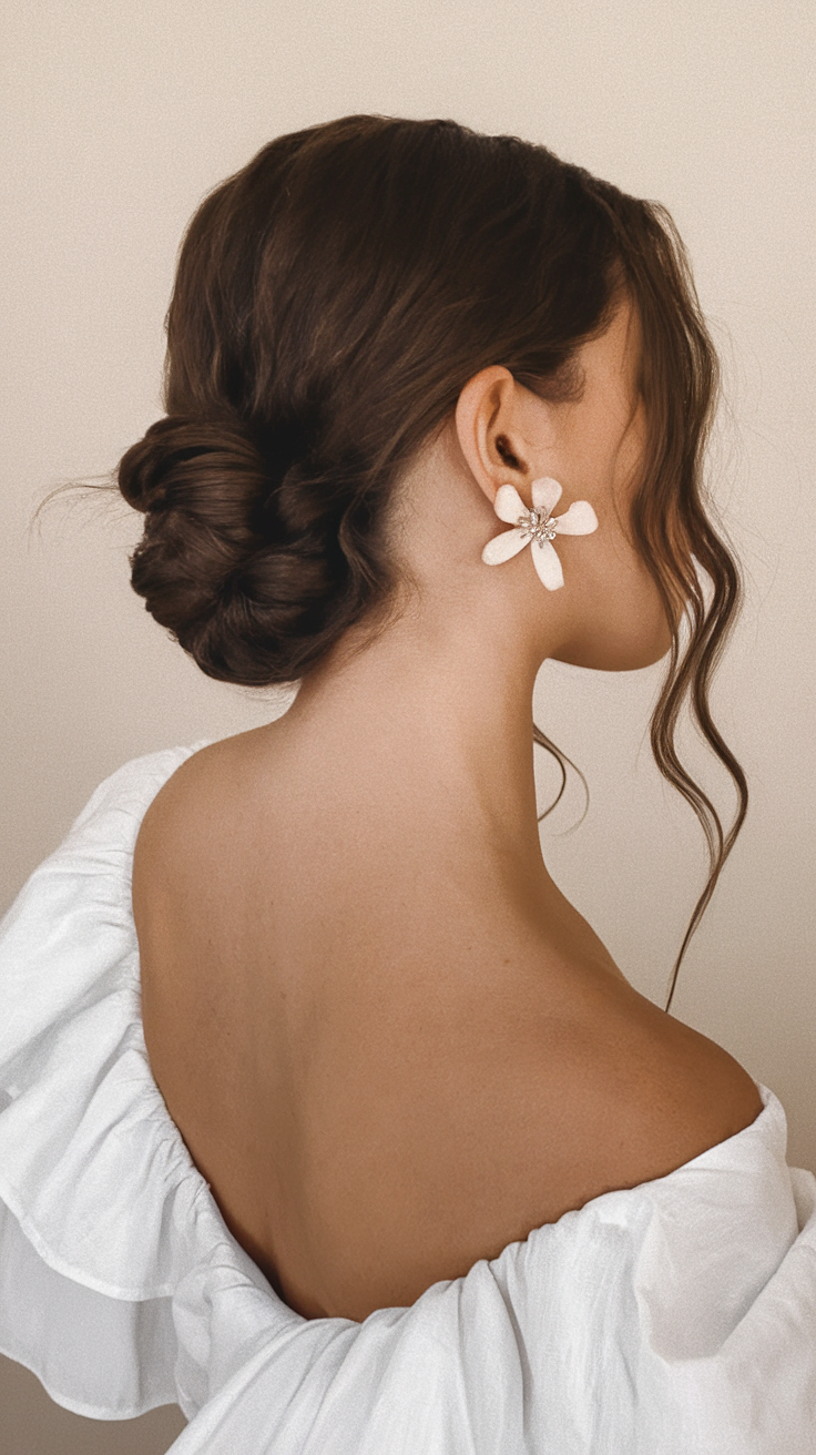 This wedding hair bridesmaid bun is a timeless and natural hair look with soft texture. The brunettes shade enhances the depth of the hairstyle, while the loosely twisted bun keeps it trendy yet easy to wear. Face-framing strands add a cute and romantic touch, making it an ideal choice for formal occasions or a simple, effortless summer style.