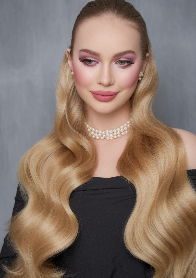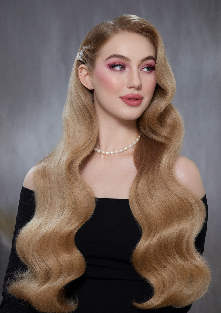 For those who love long hair, this hot Hollywood waves hairstyle is a must-try for 2025 trends. The golden blonde shade has a high-shine effect, enhancing the smooth, voluminous curls. A delicate hair clip on one side adds a fun and elegant touch, making it perfect for a black tie event or a pool party with a glamorous twist.