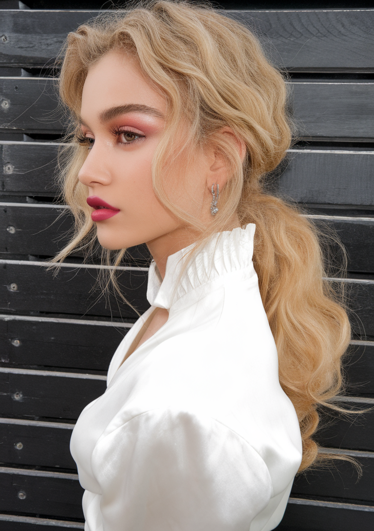 This long hair ponytail is a must-try for those who love a sleek yet aesthetic style. The ultra-smooth slick back roots transition into a bright, cool blonde length, making it a trendy choice for the season. The front face-framing tendrils soften the look, giving it a cute and feminine touch. Whether for a pool party or a black tie event, this fun hairstyle is one of the most hot 2025 choices.