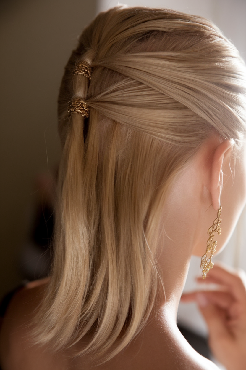 This cute and easy half-up style is perfect for medium hair lovers looking for an aesthetic upgrade. The soft, twisted strands secured with delicate golden accessories add texture and depth to the light blonde shade. The straight ends keep the style fresh and fun, making it a great option for a casual or semi-formal look.