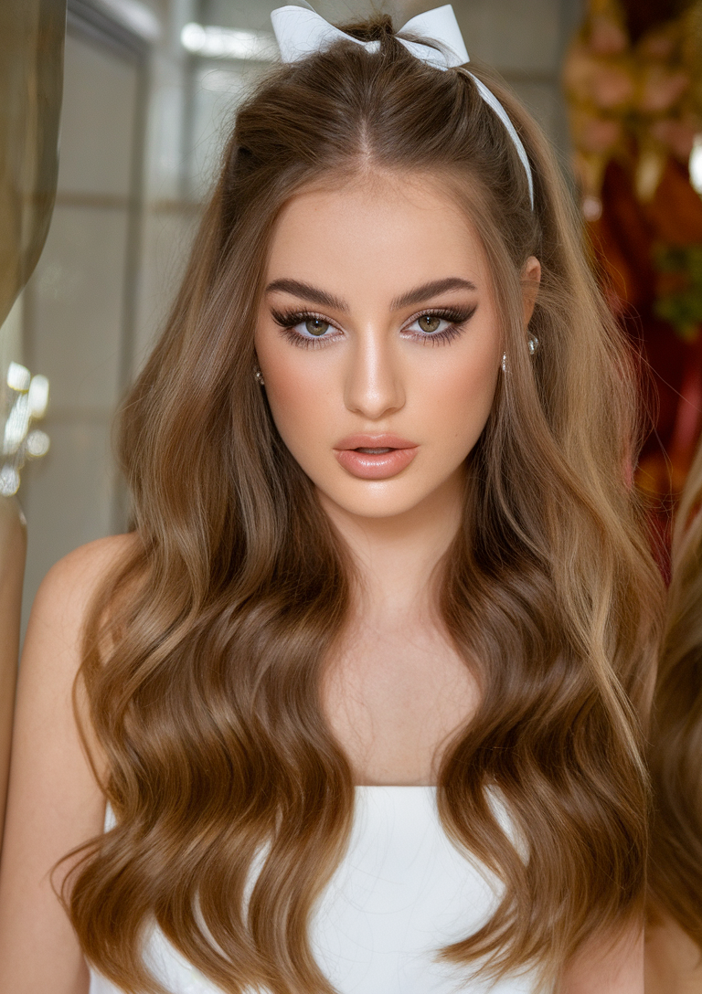 For those who love long hair, this voluminous half-up style is a 2025 trends favorite. The deep brunette shade enhances the glossy, soft waves, while the white bow adds a cute and playful touch. This fun yet elegant hairstyle is perfect for a wedding hair bridesmaid look or an effortlessly chic everyday style.