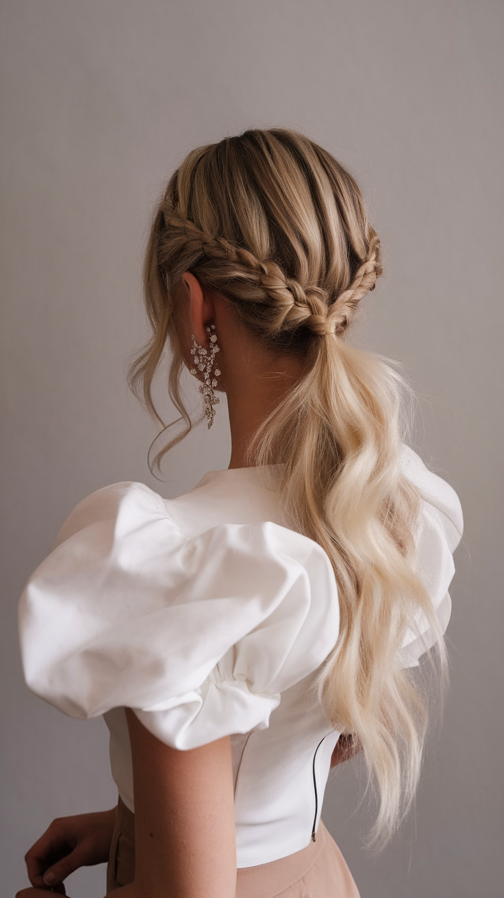 This hot hairstyle combines braids and a long hair ponytail for a romantic and structured look. The soft blonde highlights add dimension, while the loose waves keep it aesthetic and effortless. It’s an ideal wedding hair bridesmaid option or a fun way to style long hair for a casual yet polished finish.