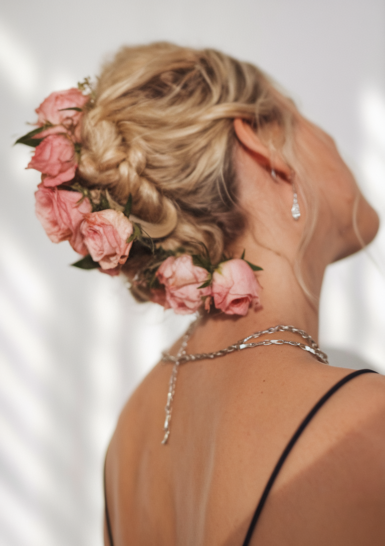 This wedding hair bridesmaid updo is an ethereal and aesthetic choice for special occasions. The braids woven into the bun create an intricate design, while the addition of fresh roses adds a trendy and romantic touch. The soft blonde shade with warm highlights complements the elegance of this cute and timeless hairstyle.