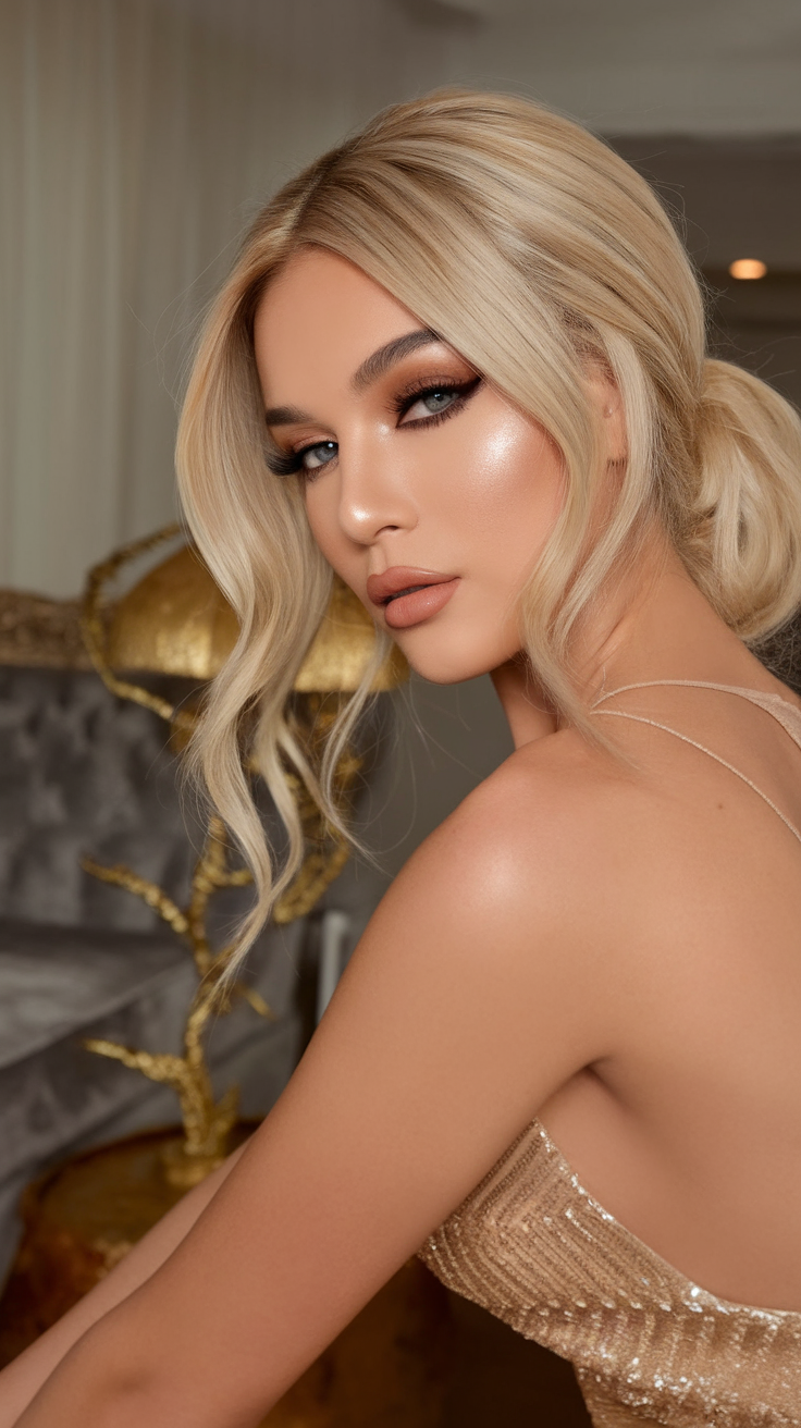 This wedding hair bridesmaid updo embraces soft elegance with a sleek blonde low bun. The natural hair shade is a perfect mix of warm and cool tones, adding depth. Loose, face-framing strands keep the look aesthetic and effortlessly cute, making it ideal for both formal and casual occasions.