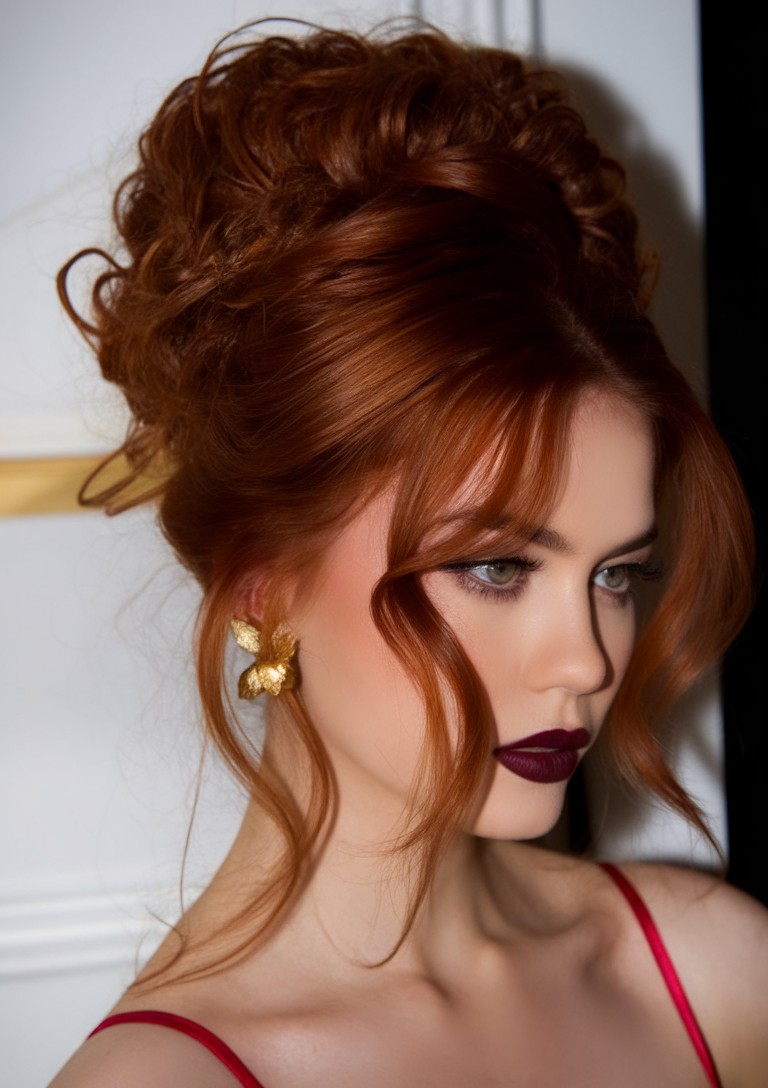This hot 2025 trends updo is a striking take on classic volume. The deep red shade adds warmth and richness, while the messy-chic bun gives a modern twist. Soft curtain bangs frame the face, creating an easy, fun, and slightly vintage-inspired finish.
