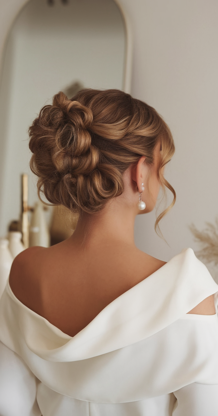 This intricate wedding hair bridesmaid updo is a perfect example of 2025 trends for formal occasions. The long hair is styled into voluminous twists and curls, adding depth and movement to the hairstyle. The warm golden-brunette tone enhances the natural hair texture, making this look both romantic and trendy. A few loose tendrils frame the face, adding a cute and effortless touch.