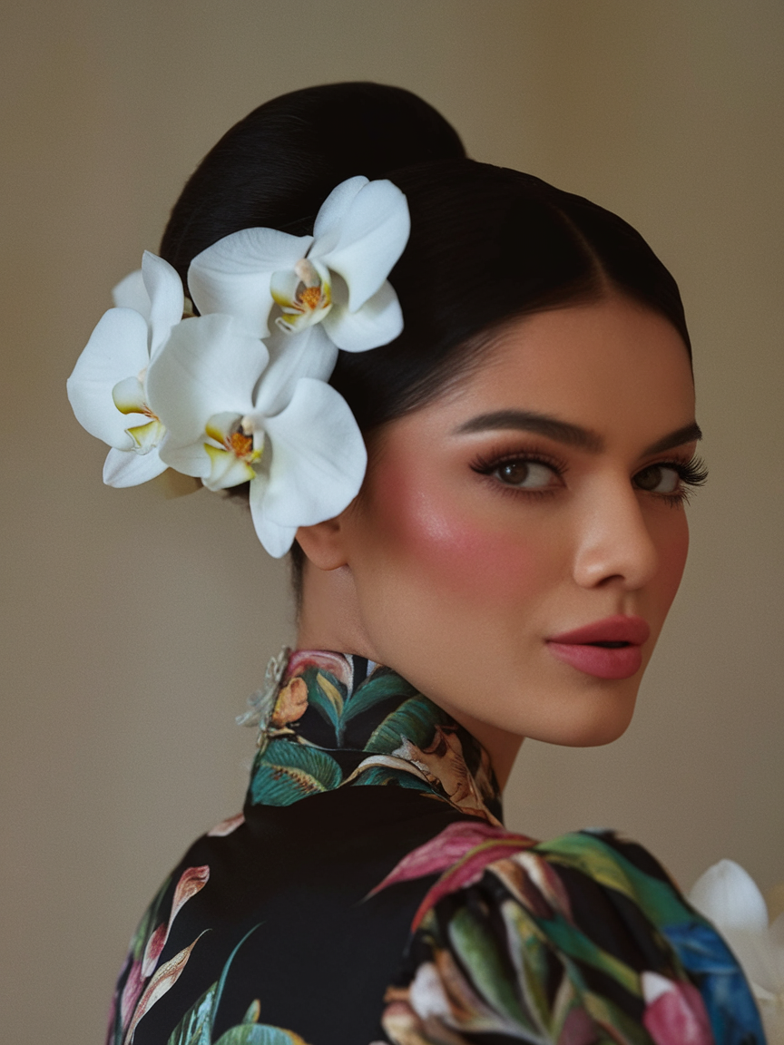 This slick back bun is a standout 2025 trends hairstyle, featuring a deep dark hair color base with a high-shine effect. The structured updo is elevated with fresh white floral accents, making it a stunning choice for special occasions. The smooth texture and sleek styling create a polished black hair look that is both elegant and aesthetic. This is a must-try for those seeking a trendy, fun, and statement-making hairstyle.