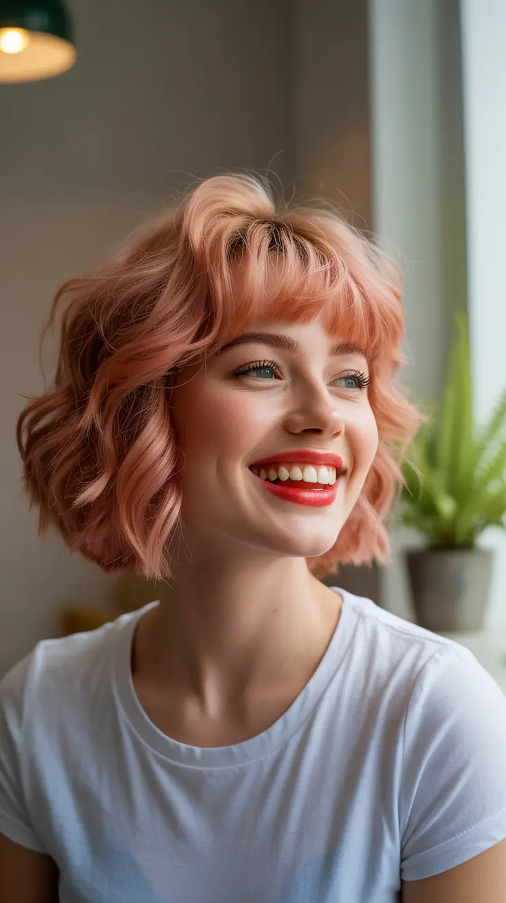 Winter is not necessarily long wave. A short rosé blonde bob is young, daring and surprisingly stylish in the season. The peachy pink undernote is warm, and the cut provides shape and character. It is a fantastic alternative to any blue eyed person because the contrast in pink makes the eyes twinkle.
