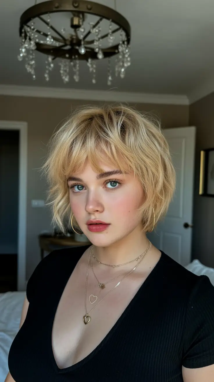 Layered cuts with texturing are not going anywhere and they are particularly nice in blonde. This shaggy head merges movement with light blonde hair, and it is ideal to use in the winter to refresh it. Its unbuttoned collar makes it flattering to green eyes and well compliments warm winter outfits.